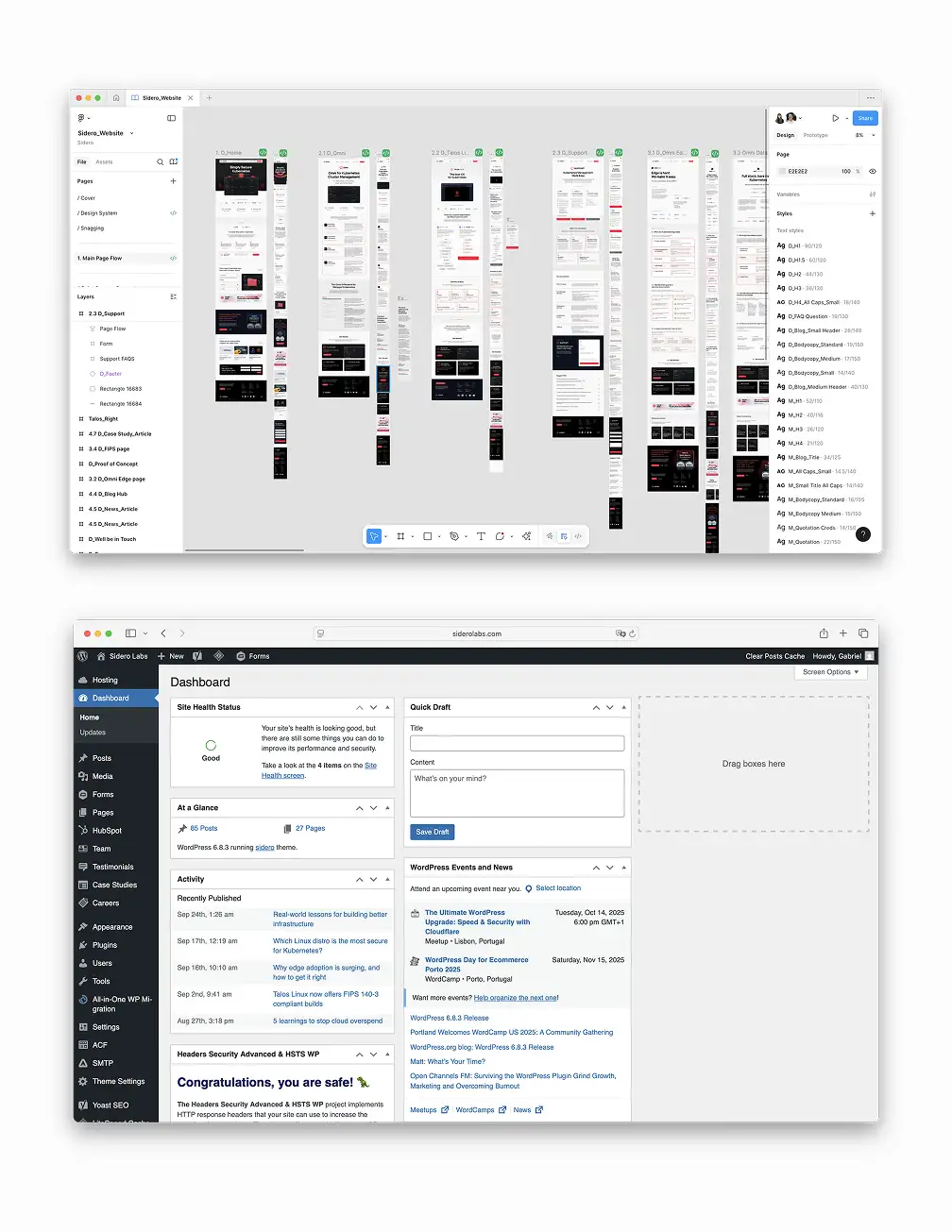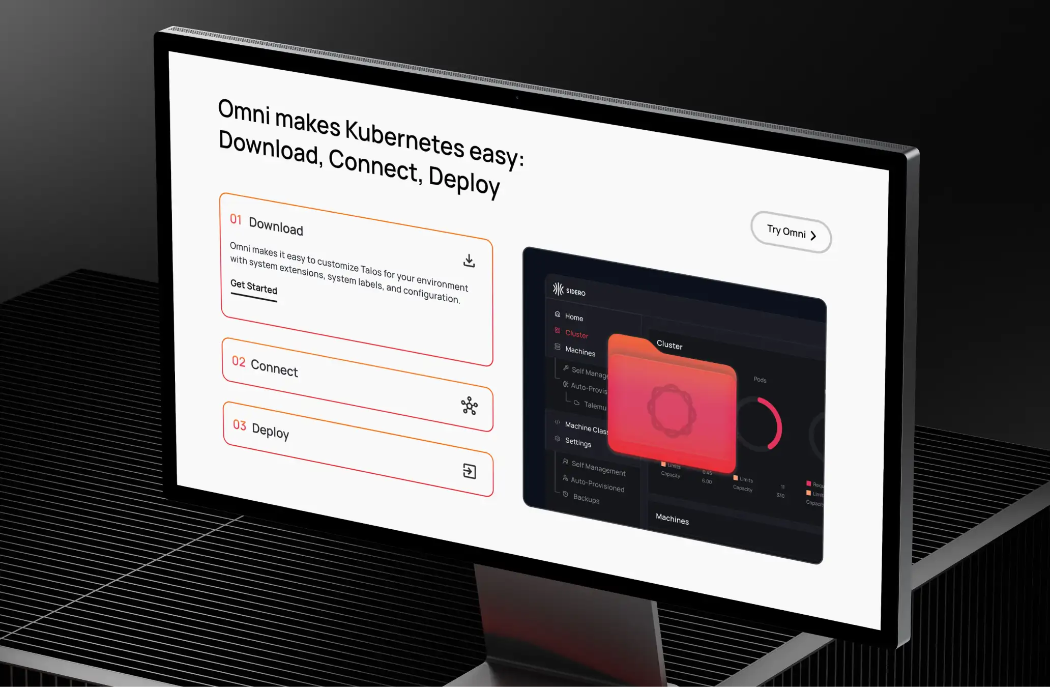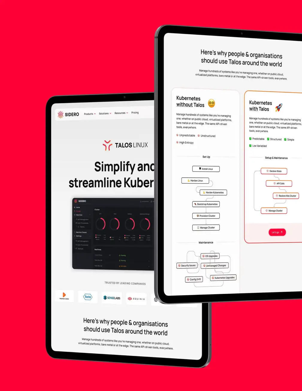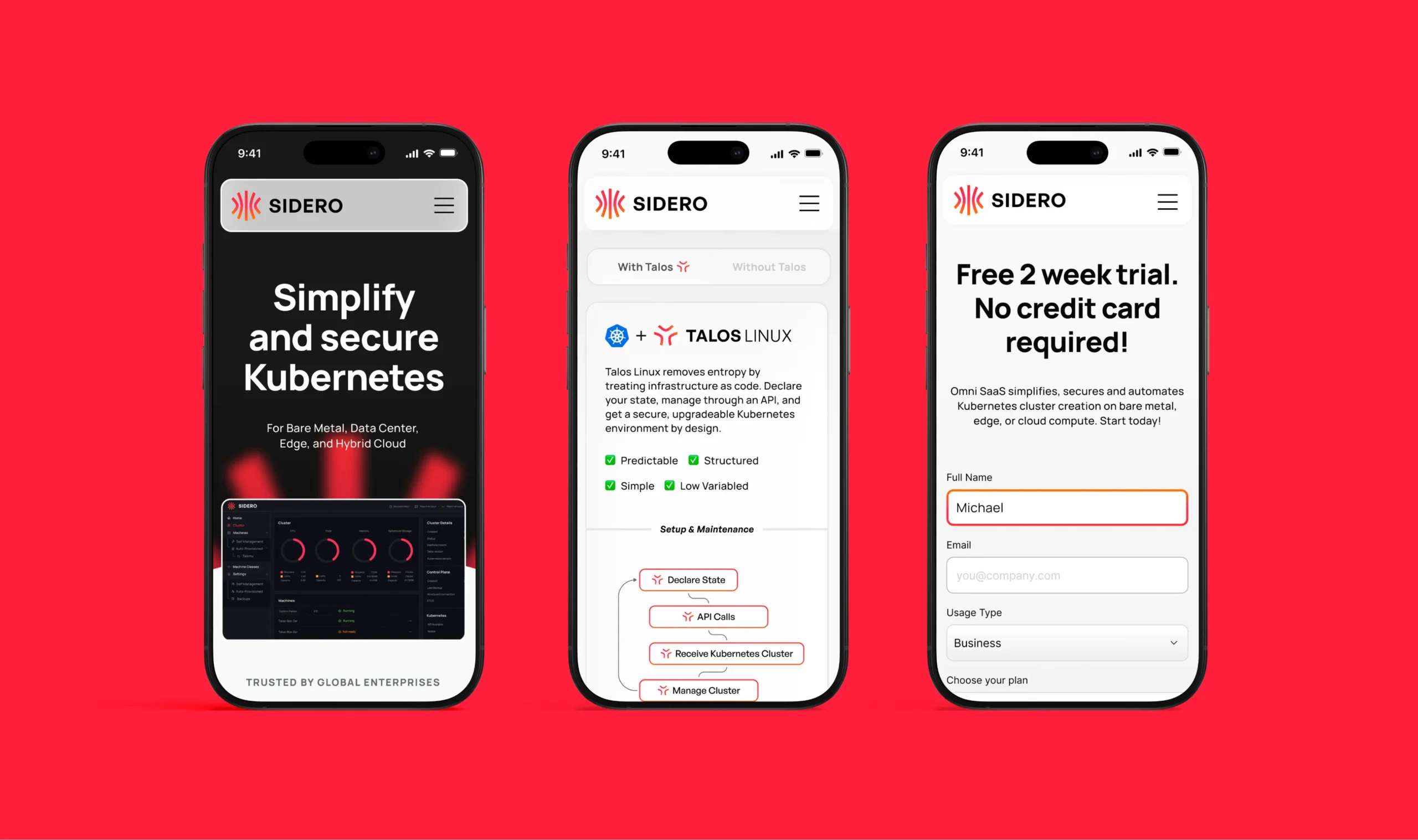 From the offset, our focus was delivering value and impact to Sidero with every decision and asset delivered. We started with the question ‘Do we need a new logo, again?’. The answer was simply ‘No’. A more polished version of what had been done was clearly the best path. With optimisations to work across channels, at all sizes, higher contrast, more confidence. Next we got to work on the website, ensuring that the content flow on each page brought clarity and simplicity to this cutting edge Kubernetes product.